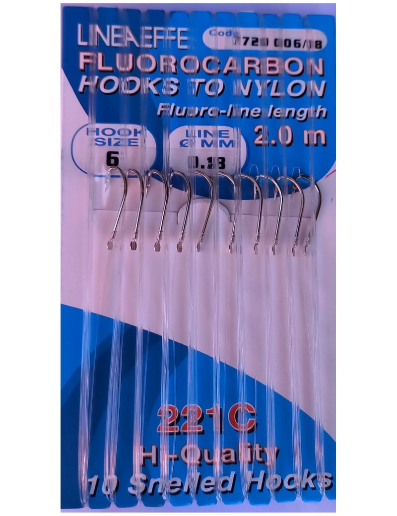 ami da pesca lineaeffe legati con fluorocarbon per avere una maggiore efficienza durante la tua sessione di pesca. ogni confezione contiene 10 ami già montati con una lunghezza di 2 metri. grazie al fluorocarbon, questi ami sono praticamente invisibili nell'acqua e offrono una migliore resistenza all'abrasione.
