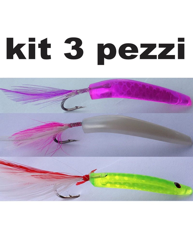IL KIT E COMPOSTO DA : 3 UNGHIETTE LA BIANCA E LA ROSSA DI CM.5 UNGHIETTA GIALLA DI CM. 4,5 TUTTE ARMATE CON AMO N. 2.