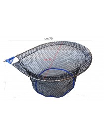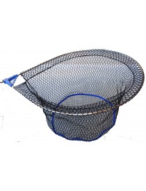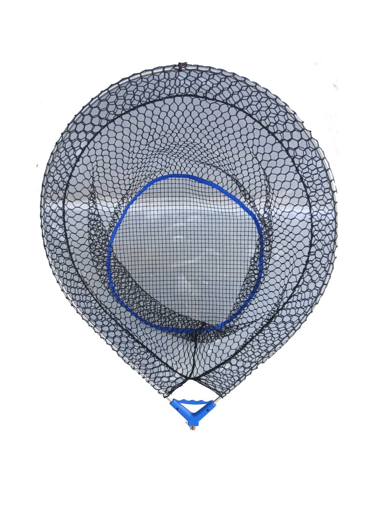 testa di guadino di dimensione notevole costruita in alluminio con rete idrorepellente in maglia da 2 cm. e fondo in rete gommata da cm. 1.